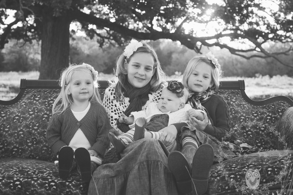 This photoshoot was an absolute blast!! But... before I go any further...did you happen to noticed that INCREDIBLY AWESOME vintage couch?? As much as I would like to say," Oh yes, it's my latest purchase for family sessions.', I cannot. It belongs to this lovely family. I must admit, the thought of stealing it did cross my mind! :) The momma had envisioned her family sitting on the couch beneath a beautiful old tree with the sun glistening through the trees. The Lord blessed us with a beautiful evening and allowed us to take some amazing photos. I find such joy in the planning process of a photoshoot and then watching all of the details unfold and come together so beautifully- it's just AMAZING! The lovely momma and I spent ...oh I'd say about...5 hours deciding on clothing for the family. There was not a chair, room, or spot on the floor, that was not COVERED with clothing options! but... It was definitely worth the time and effort. We are simply thrilled with the way the colors POP OUT and look so stunning! During the shoot, you could just see and feel the love they have for one another! Everyone was in constant giggles, partly due to the little girl sitting on her daddy's lap- so cute:). This session makes my heart leap with excitement and love for these photos and I hope they make you feel the same way!